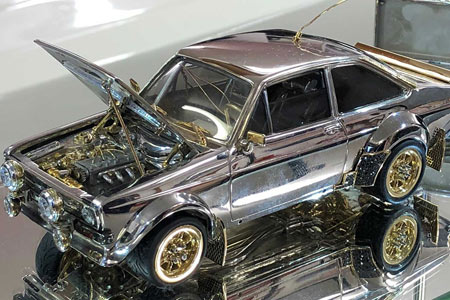 Ein Ford Escort im Maßstab 1:25 wird demnächst im Internet versteigert. Alleine der Materialpreis beträgt 90.000 Euro. Der britische Goldschmied Russell Lord hat es in Handarbeit vorwiegend aus Silber, Gold und Diamanten gefertigt.