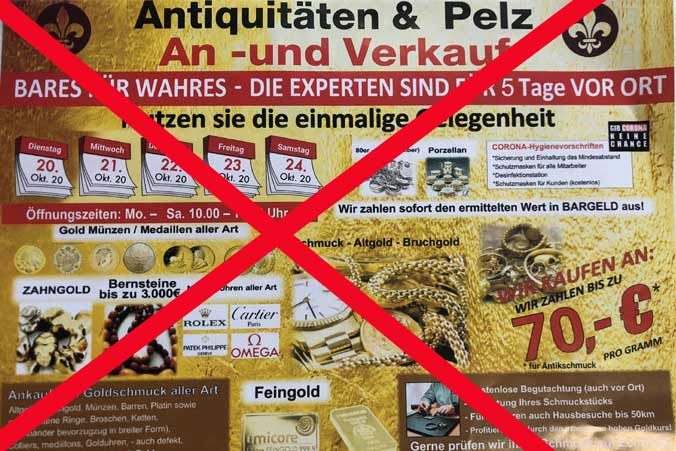 Mitarbeiter des Gewerbeamtes Potsdam haben laut Angaben der Stadtverwaltung in der vergangenen Woche eine Veranstaltung zum Ankauf von Gold, Schmuck und Antiquitäten kontrolliert, die in einem Hotel in Potsdam stattfand. Wegen festgestellter Verstöße gegen die Gewerbeordnung