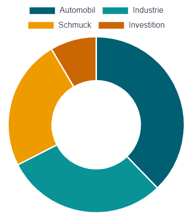 Obwohl die Schmucknachfrage wächst, wird die Gesamtnachfrage stark von der Automobil- und Industriebranche sowie von zunehmenden Investitionen getragen. Diese Diversifizierung stabilisiert den Markt.