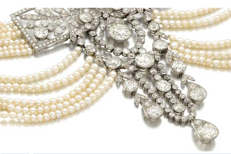 Eine Chokerkette aus dem frühen 20. Jahrhundert erzielte 304.800 GBP (362.060 €) und damit mehr als das Doppelte seines Schätzpreises von 150.000 GBP (178.179 €). Das Stück hat eine mit Diamanten im Rosenschliff besetzte Plakette, an der ein großer tropfenförmiger Diamant in einer durchbrochenen Einfassung aus Altschliff und cushionförmigen Diamanten sowie 12 Perlenreihen hängt. Es enthält insgesamt etwa 44 Karat Diamanten.