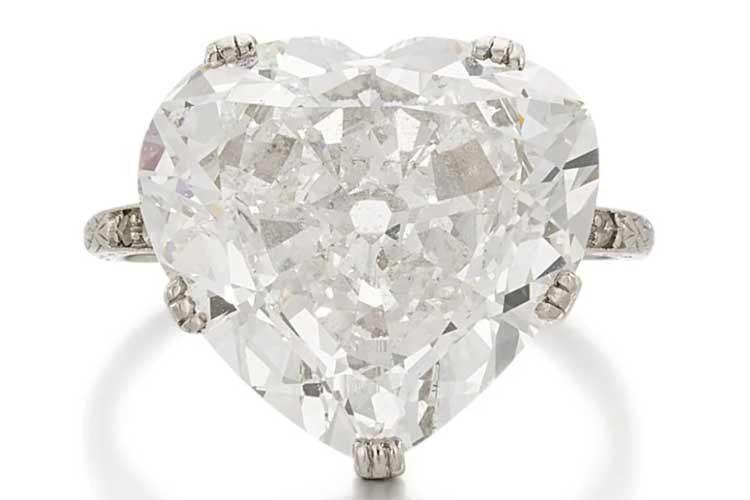 Dieser Ring von Black Starr & Frost trägt einen herzförmigen Diamanten, 7,42 Karat, Farbe E und der Reinheit SI1, zwischen eingravierten Schulterstücken, die mit Diamanten im Einzelschliff besetzt sind. Er erzielte einen Preis von 165.100 GBP (196.116 €), mehr als das Doppelte der Schätzung von 70.000 GBP (83.143 €).