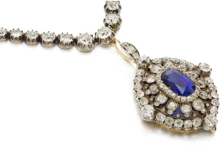 Sotheby's verkaufte diesen Anhänger aus dem späten 19. Jahrhundert mit einem oval geschliffenen Ceylon-Saphir, 11,44 Karat, der von cushionförmigen Diamanten umgeben ist, und mit graduierten cushionförmigen Diamanten in Pinched-Collet-Fassungen entlang der Halskette versehen ist. Es wurde innerhalb seiner Preisspanne für 95.250 GBP (113.145 €) verkauft.
