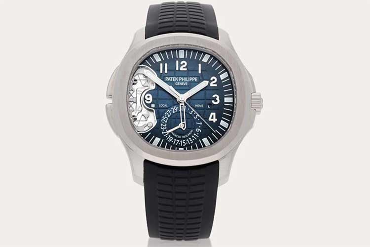Diese Patek Philippe Aquanaut Travel Time Automatik-Armbanduhr aus Weißgold wurde innerhalb ihrer Preisvorstellung für CHF 336.550 (360.109 €) verkauft.