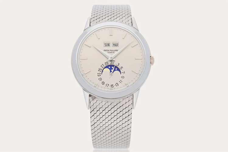 Eine weitere Armbanduhr von Patek Philippe aus Weißgold mit ewigem Kalender und Mondphasen aus dem Jahr 1971 kam für 330.200 CHF (353.314 €) unter den Hammer und lag damit am oberen Ende der Schätzung.