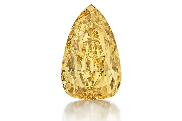 Das Golden Canary-Collier ist mit einem Tropfen, 303,10 Karat, fancy-deep-brownish-yellow, lupenrein, besetzt.