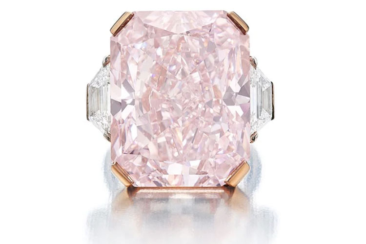 Dieser Ring ist mit einem 40,29-Karäter im Radiant-Schliff, fancy-light-pink, VS2 besetzt.
